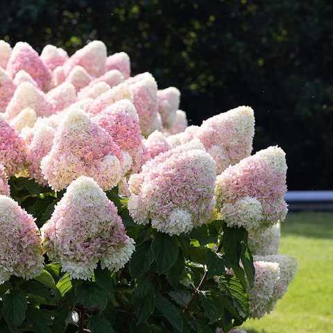Одна из самых красивых метельчатых гортензий "Свит Саммэ" в переводе означает Сладкое Лето. Куст высотой до 150 см и шириной до 120 см, компактный, крона густая, цветет очень обильно. Соцветия крупные, плотные 30-35 см в длину. Цветки в основном стерильные, при роспуске зеленоватые, затем бело-кремовые, осенью соцветия окрашены одновременно в светло-розовый, розово-зеленоватый и белый цвет. Цветение начинается в июле и продолжается до осени. Это отличное растение для балкона или террасы, для массовых посадок или для кустарников. Морозостойкость высокая: до -30 ºC.